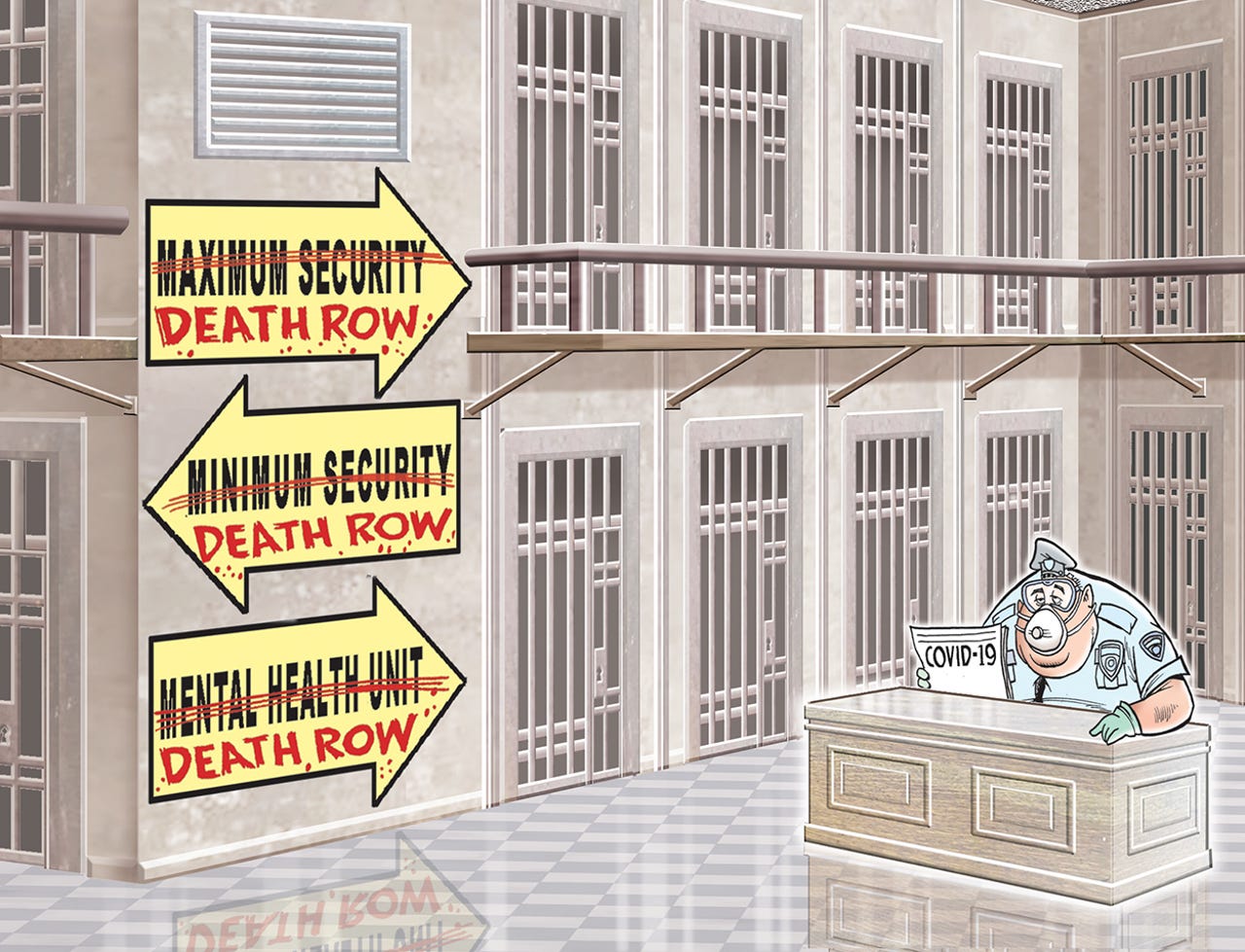 This political cartoon is a commentary on the rates of corona virus in the prisons. Every aspect of the prison system now seems like death row.