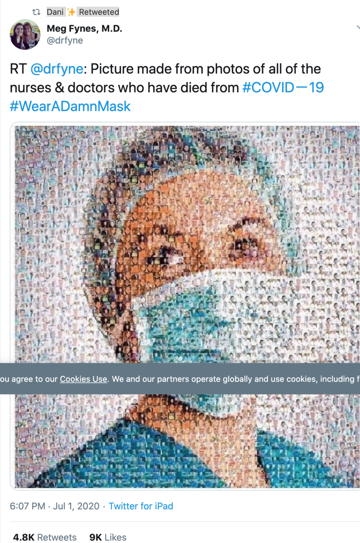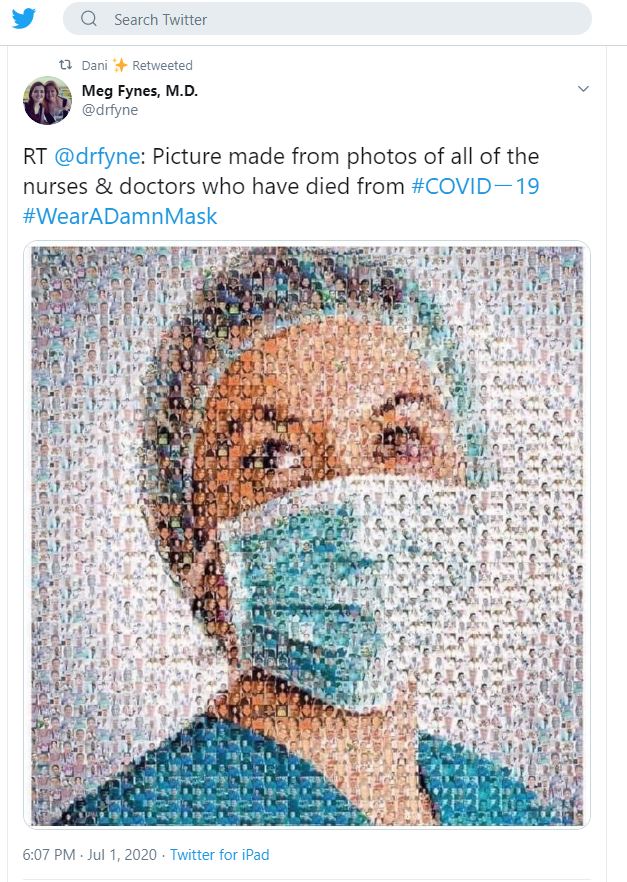 This item was added TAGS v6.1.9.1. I originally searched under the hashtag #wearadamnmask. Within that search, I have chosen to add the following tweet because it showcases the sacrifices that have been made in the medical field during the pandemic. It also attempts to show the gratitude that many people have for their medical professionals.