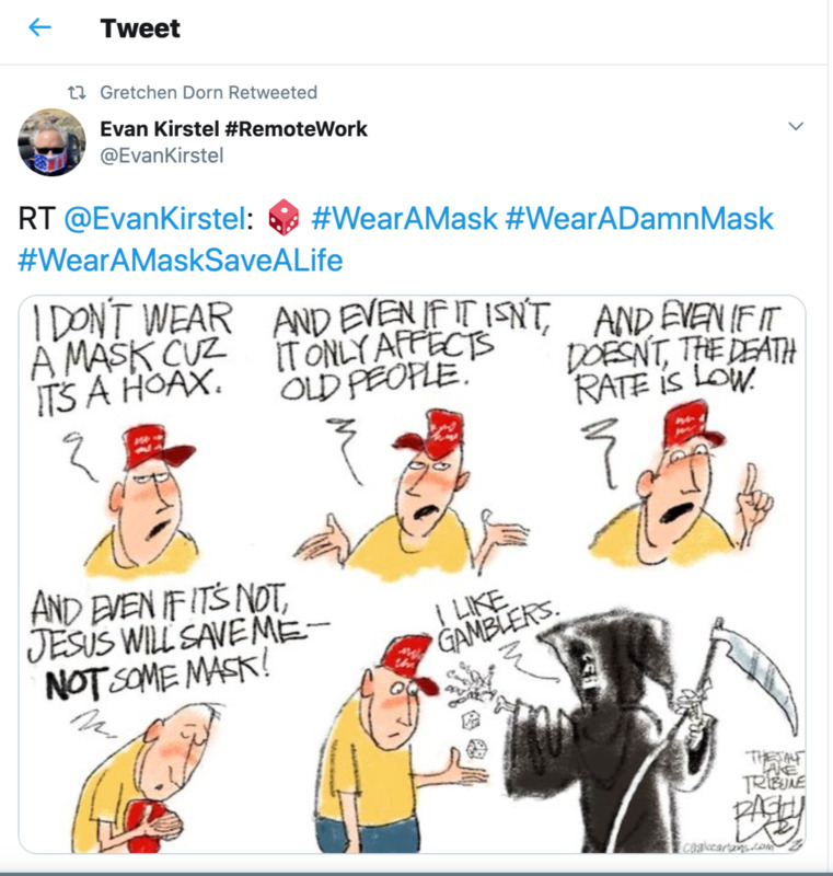 This item was added TAGS v6.1.9.1. I originally searched under the hashtag #wearadamnmask. Within that search, I have chosen to add the following tweet because it describes the arguements that many people make for not having to wear a mask.