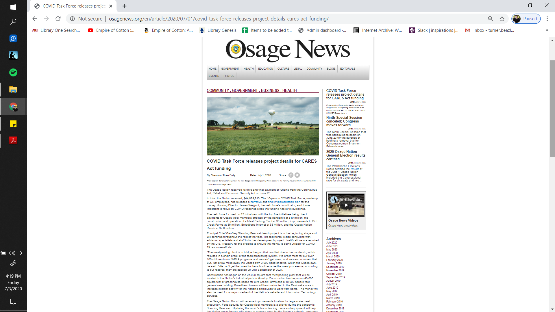 "The Osage Nation received its third and final payment of funding from the Coronavirus Aid, Relief and Economic Security Act on June 26. In total, the Nation received, $44,879,813. The 16-person COVID Task Force, made up of ON employees, has released a narrative and final implementation plan for the money. Housing Director James Weigant, the task force’s coordinator, said it was important to focus on COVID response since the funding has strict guidelines."