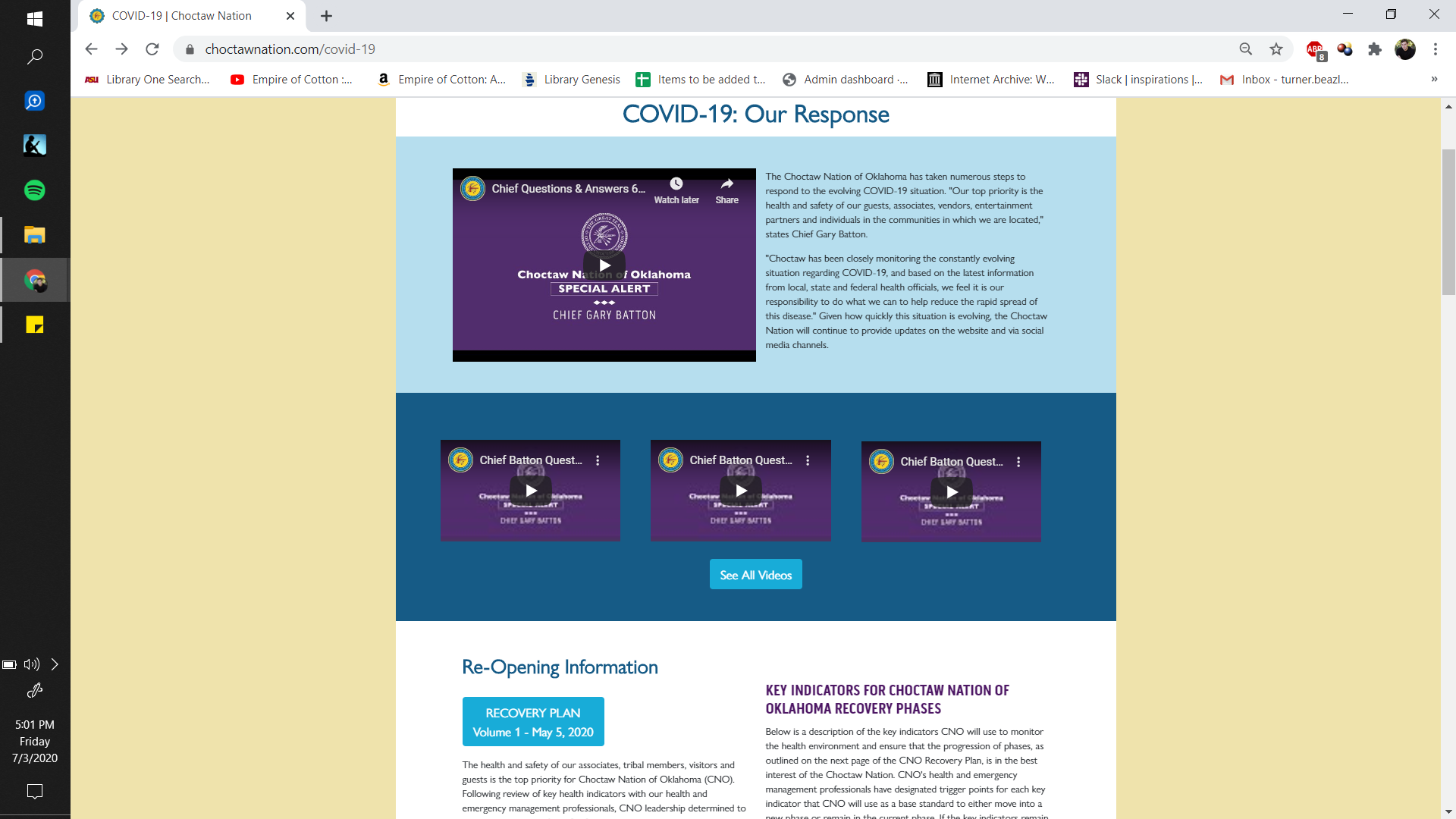 "The health and safety of our associates, tribal members, visitors and guests is the top priority for Choctaw Nation of Oklahoma (CNO). Following review of key health indicators with our health and emergency management professionals, CNO leadership determined to move into Phase III of the CNO Recovery Plan beginning Friday, June 12."