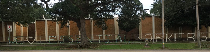 WE ❤️ ESSENTIAL WORKERS made out of paper and plastic cups in the fence surrounding Haynes Academy