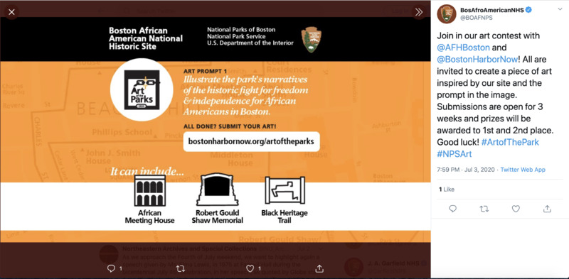 Twitter post from the Boston African American National Historic Site detailing their prompt for the #ArtofThePark contest. Participants are prompted to create a piece of art inspired by the site that illustrates the narrative of the BFNHS. Campaigns like this highlight how cultural heritages sites sought to engage with their audiences during social distancing, and how they hoped to continue to have the public interact with the histories they commemorate.