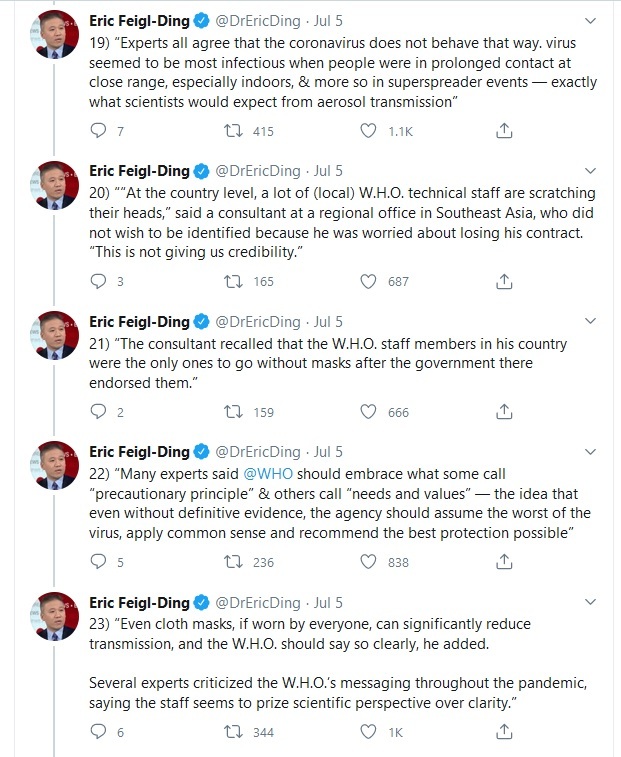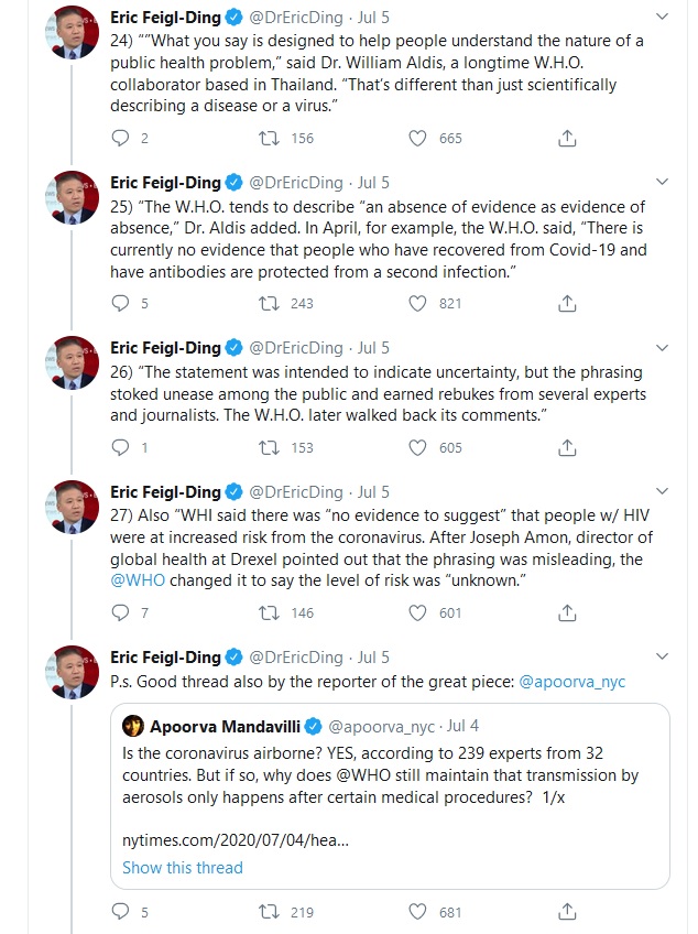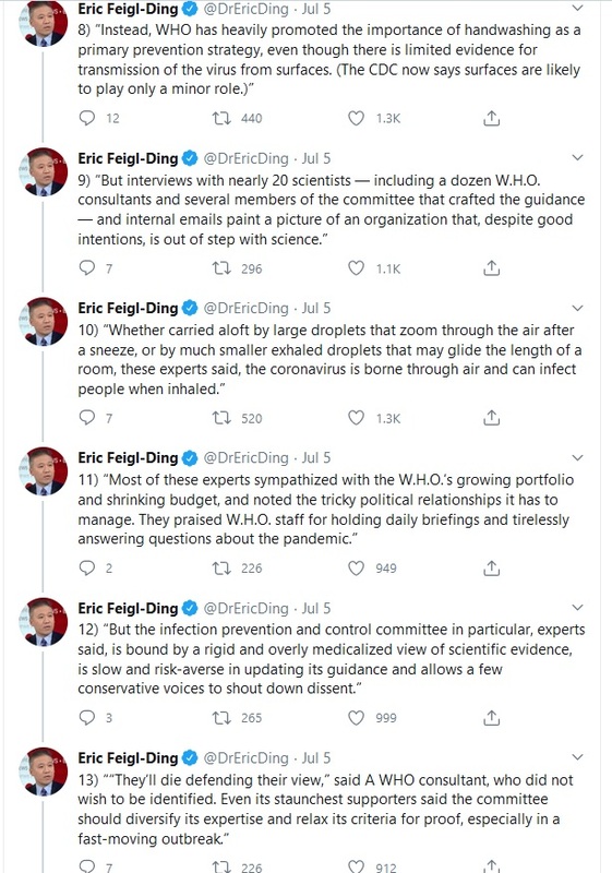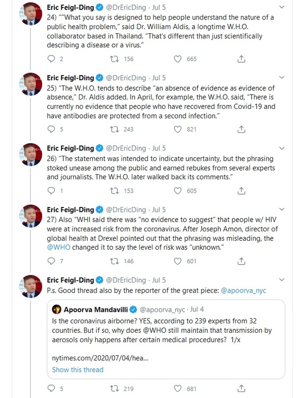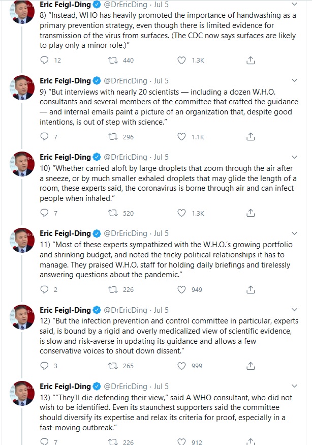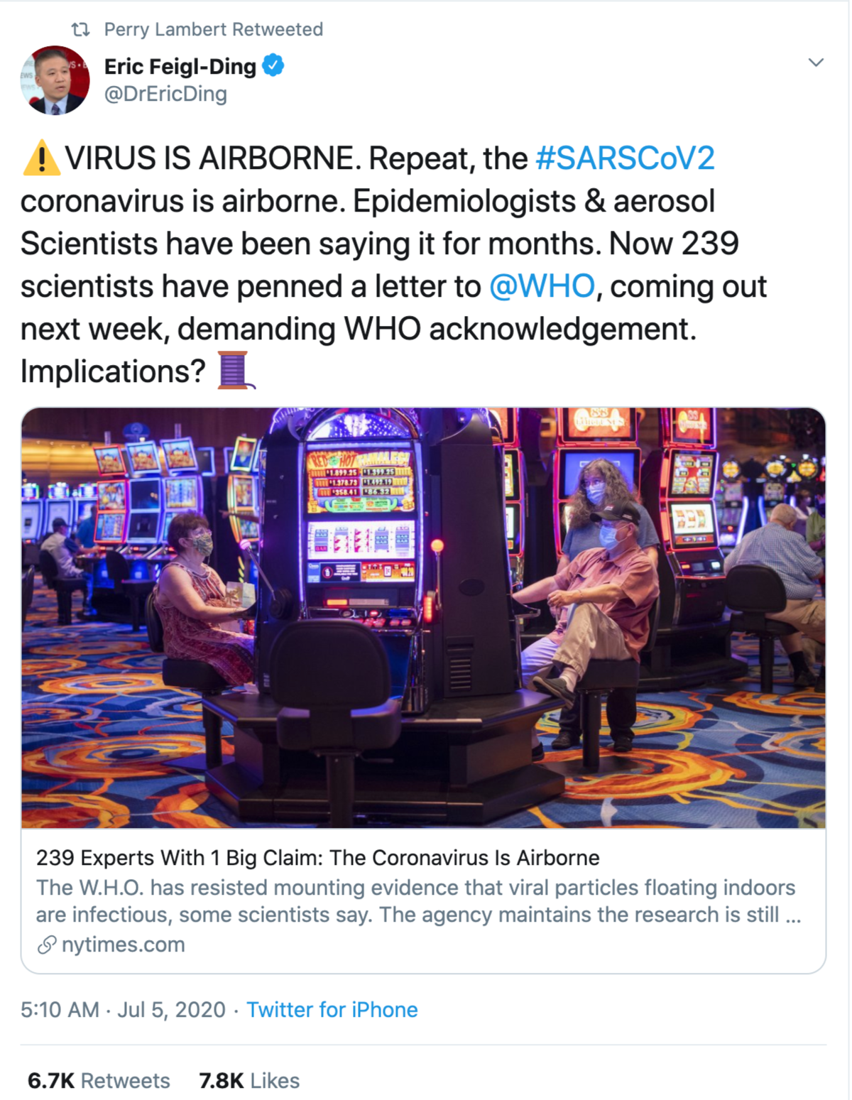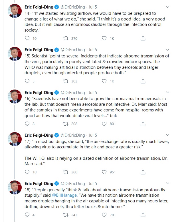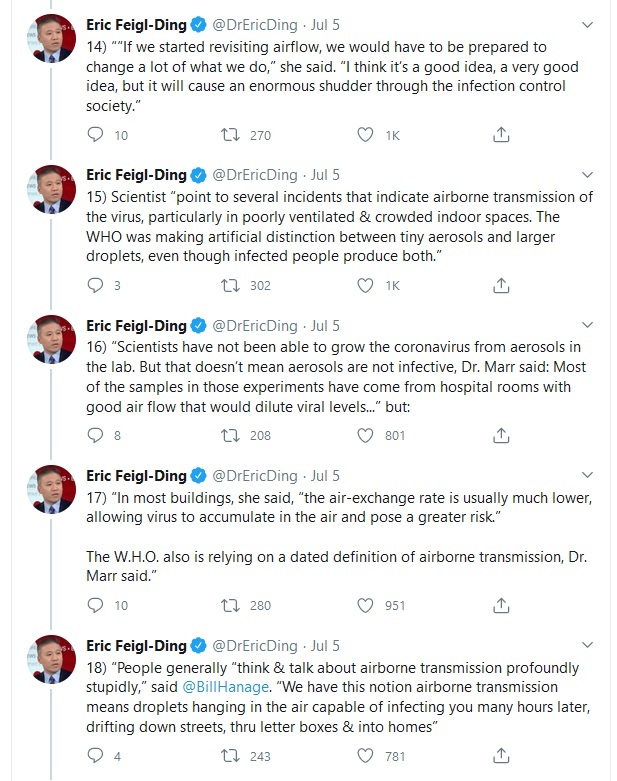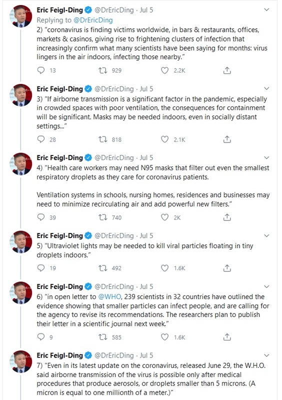 The coronavirus emphasis in the beginning was always on washing our hands and the time period that it could remain active on various surfaces. As it has changed and developed, scientists and doctors have struggled to understand its nature while the public has been somewhat resistant to trusting the advice of professionals. Dr. Ding is highlighting the importance of everyone being on the same page and keeping the info as current as is possible.