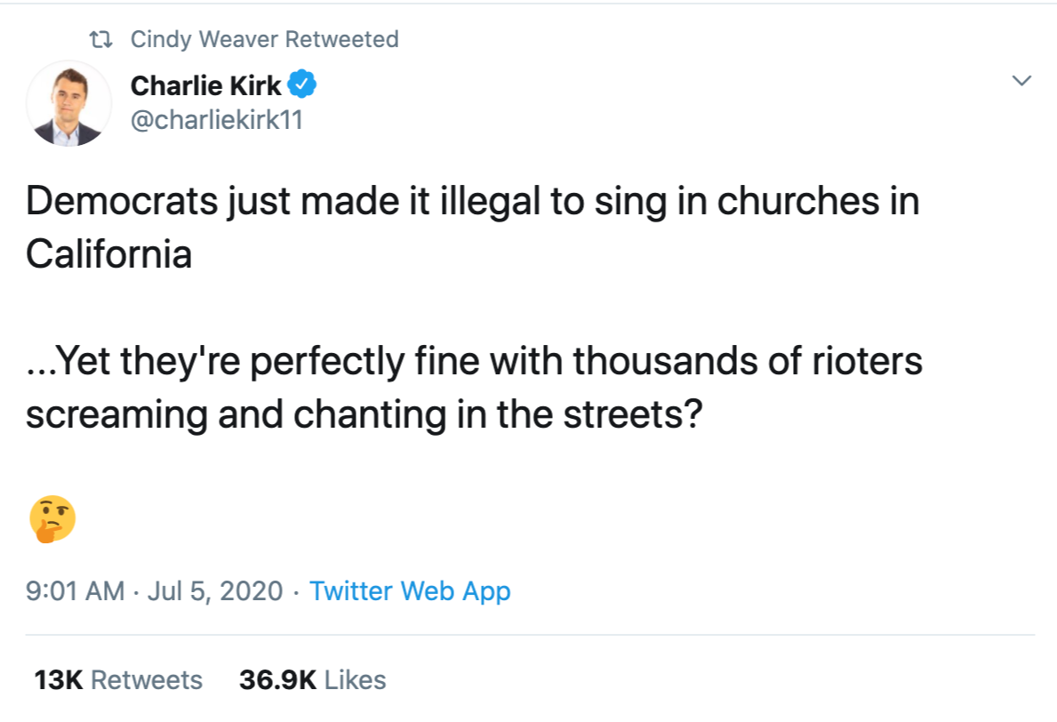 California is currently experiencing a surge in cases, and the state government has taken certain precautions to provide a safe environment as it tries to open up. This has been specifically targeted at areas where people are gathering in large groups and where social distancing can prove somewhat difficult. Both users seem to be questioning the targeting of churches while people are able to still gather to protest.