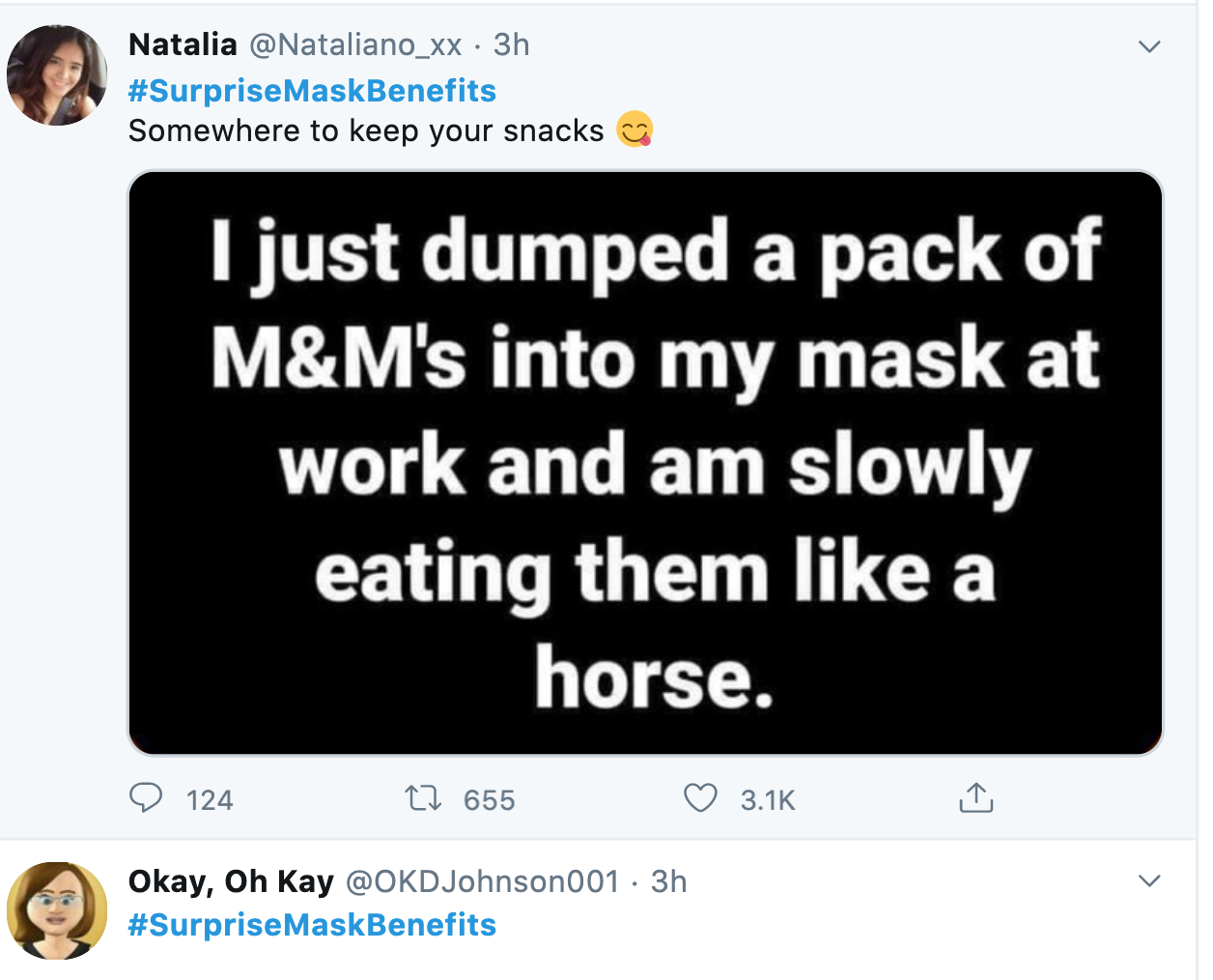 Face Masks are everywhere and everyone is wearing them. There have been many humorous treatments of this "garment." This post claims to have stuffed his or her face mask with M & Ms and munches on them like a horse with an oat bag attached to its mouth. Haha