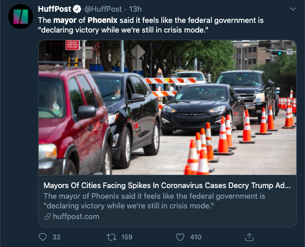 As a hometown Phoenician, it saddens me to see my sates role in the pandemic story. Just this week Arizona went back into partial lockdown as ICU's filled up. I want to keep adding Arizona stories to the archive in order to document the poor response here from both the government and public. The state traded in a few weeks of being fully reopened for potentially months of re-lockdown.