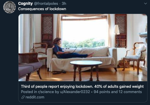 I found this report both amusing and informative, and a good item to include in the archive. With most peoples lives getting more sedentary during lockdown, weight gain is not surprising to see. Adding into this would be general increases in stress also contributing. What i found most interesting is the 1/3 of people enjoying lockdown. Seeing that made me wonder what behaviors and patterns will persist even past covid, such as things like working from home.