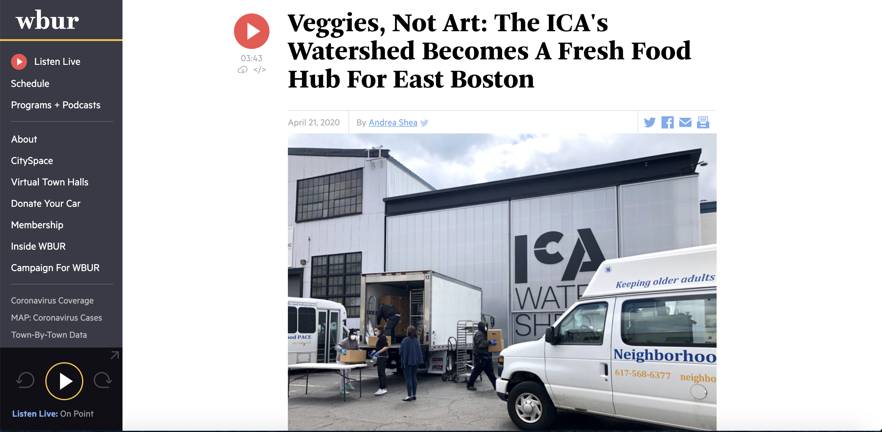 News story published by WBUR about the use of the Institute of Contemporary Art's Watershed as a food distribution site for families struggling with food insecurity. The story outlines the organizations that the ICA partnered with, and how the space is being utilized. As museums are no longer able to use their space to welcome visitors, some have sought to build on their community partnerships and use these facilities to benefit communities that are facing the economic and health effects of the CoVid-19 pandemic.