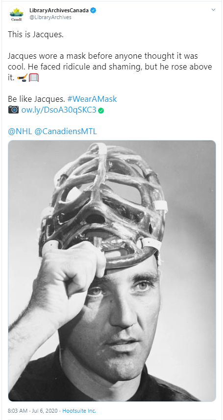 A tweet from the official twitter account of Library and Archives Canada reminding the public that when goalies first started wearing masks (the pictured Jacques Plante was the first) they were laughed at and derided by fellow players and fans as weak. Now, however, we acknowledge hockey masks save players from disfigurement or even death at the hands of a puck, stick, or opponent's skate. LAC is pointing out the same logic applies to wearing non-medical face masks to prevent the spread of covid19.