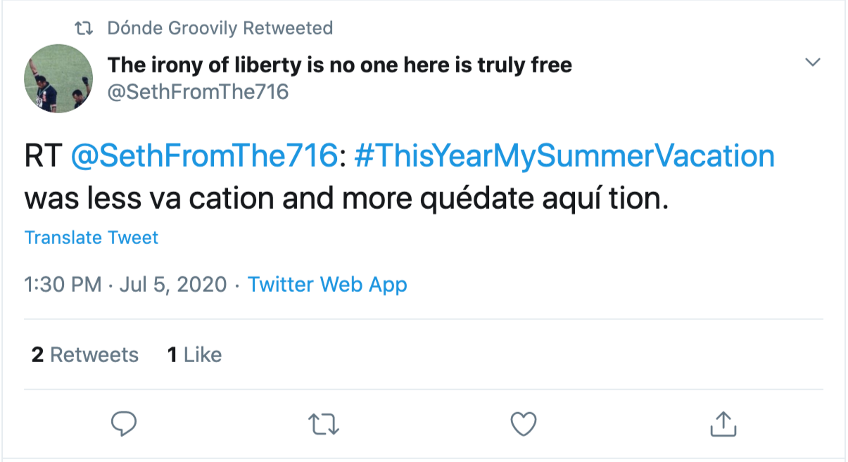 This item was added TAGS v6.1.9.1. I originally searched under the hashtag #thisyearmysummervacation. Within that search, I have chosen to add the following tweet because it showcases some of the humour that individuals are using to make light of the quarantine situation.