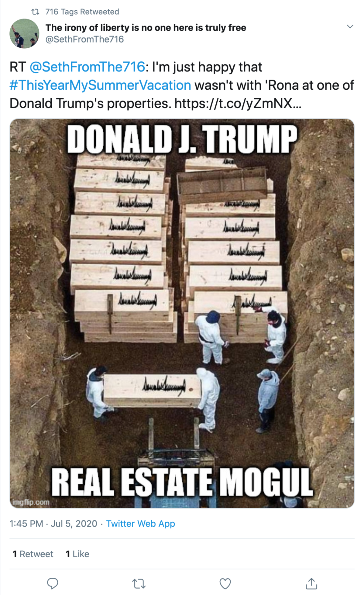 This item was added TAGS v6.1.9.1. I originally searched under the hashtag #ThisYearMySummerVacation. Within that search, I have chosen to add the following tweet because it describes the anger that people feel towards the President over his handling of the coronavirus