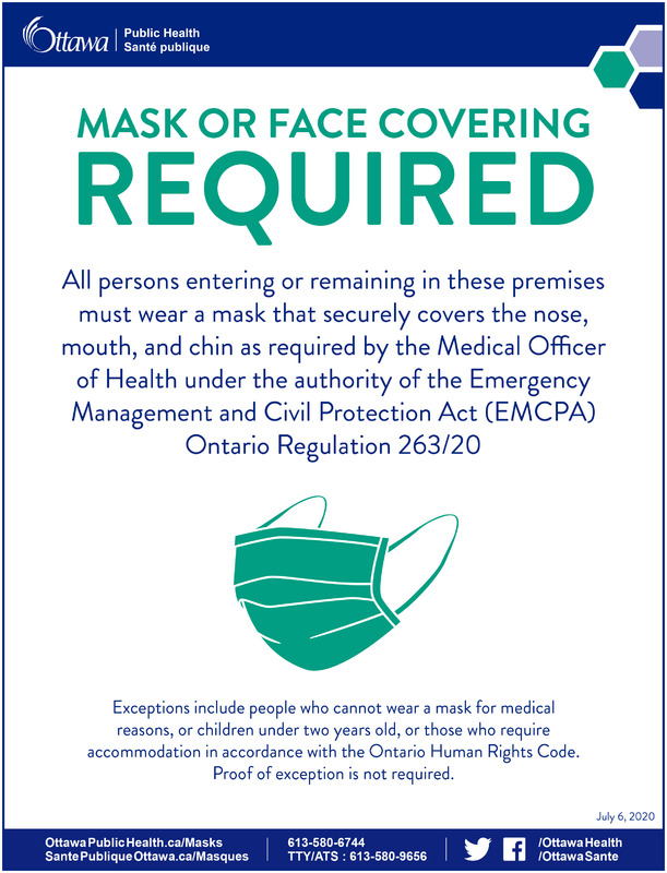 poster accompanying a tweet by Ottawa Public Health formally announcing that the Chief Medical Officer of Health, Dr. Vera Etches, has declared masks or other face coverings mandatory in public indoor spaces. The city of Ottawa is expected to vote on a bylaw to the same effect on July 15. The accompanying tweet reads: "As you’ve likely heard, Ottawa Public Health is mandating the use of masks in many indoor public spaces, effective at 12:01am July 7, 2020. Please read the letter of instruction from