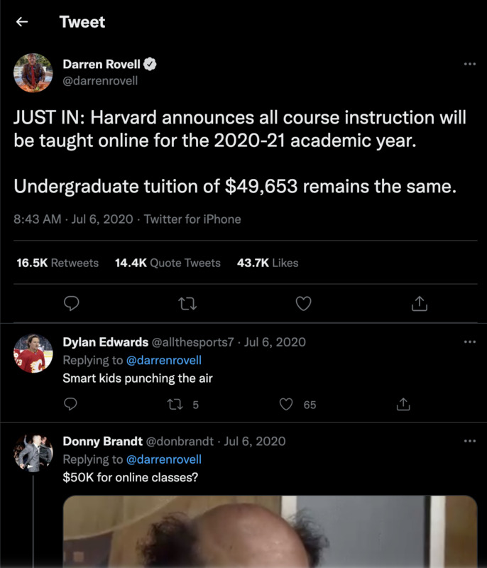 Harvard just announced that all their courses will be online for the upcoming school year due to pandemic. This includes all undergrad and graduate courses. Harvard becomes one of the first universities to announce they will be fully online for the year. Other universities may follow suit soon.