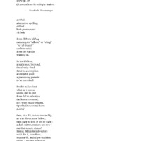 Not a "story" in the traditional sense, these are a collection of poems that nonetheless implicitly serve as narrative/tell the story of how an aspiring writer uses the time to harness all the stress, turn it from distress into eustress to de-stress, and thereby find a strategy for survival through creative expression. In each poem, as annotation, the direct connection to COVID is described.
