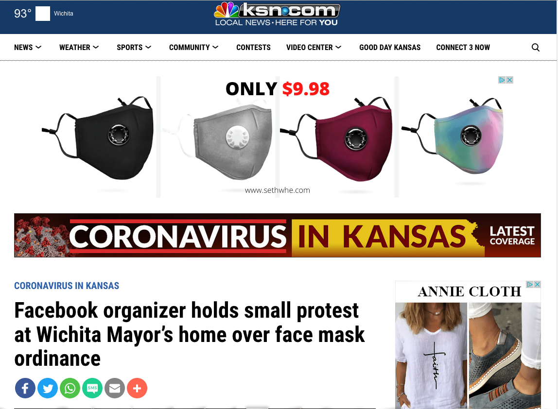 This news article from KSN, a Kansas news network, highlights the aggravation of political tensions that have only gotten worse with COVID-19's disruption of US society. In a move reminiscent of protestor tactics in St. Louis, Missouri, a group of Wichitans, disgusted with the mayor's successful push to implement city-wide mask use, staged a protest outside his residence, with its organizer even advocating, should participants choose, to exercise "Second Amendment rights" as a sign of protest. Although not a large demonstration, this article nevertheless adds to the emerging portrait of a country and its communities cleaved by politics and a pandemic.