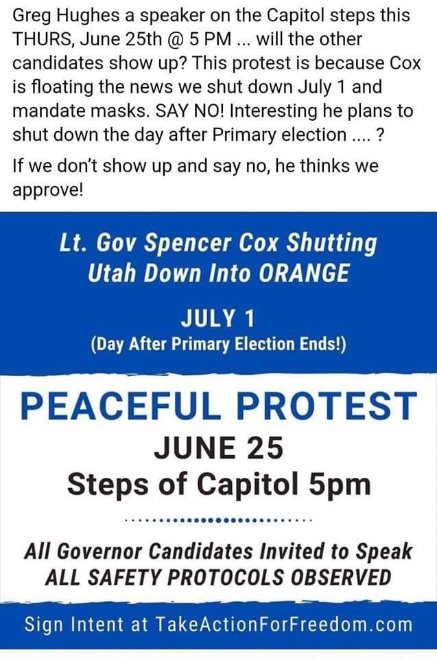 As wearing masks increasingly becomes a political issue, a political protest is being organized in Utah. This image was circulating in local community Facebook groups. Protestors are vehemently opposed to Lieutenant Governor Cox even suggesting that mask wearing be mandated in public.
