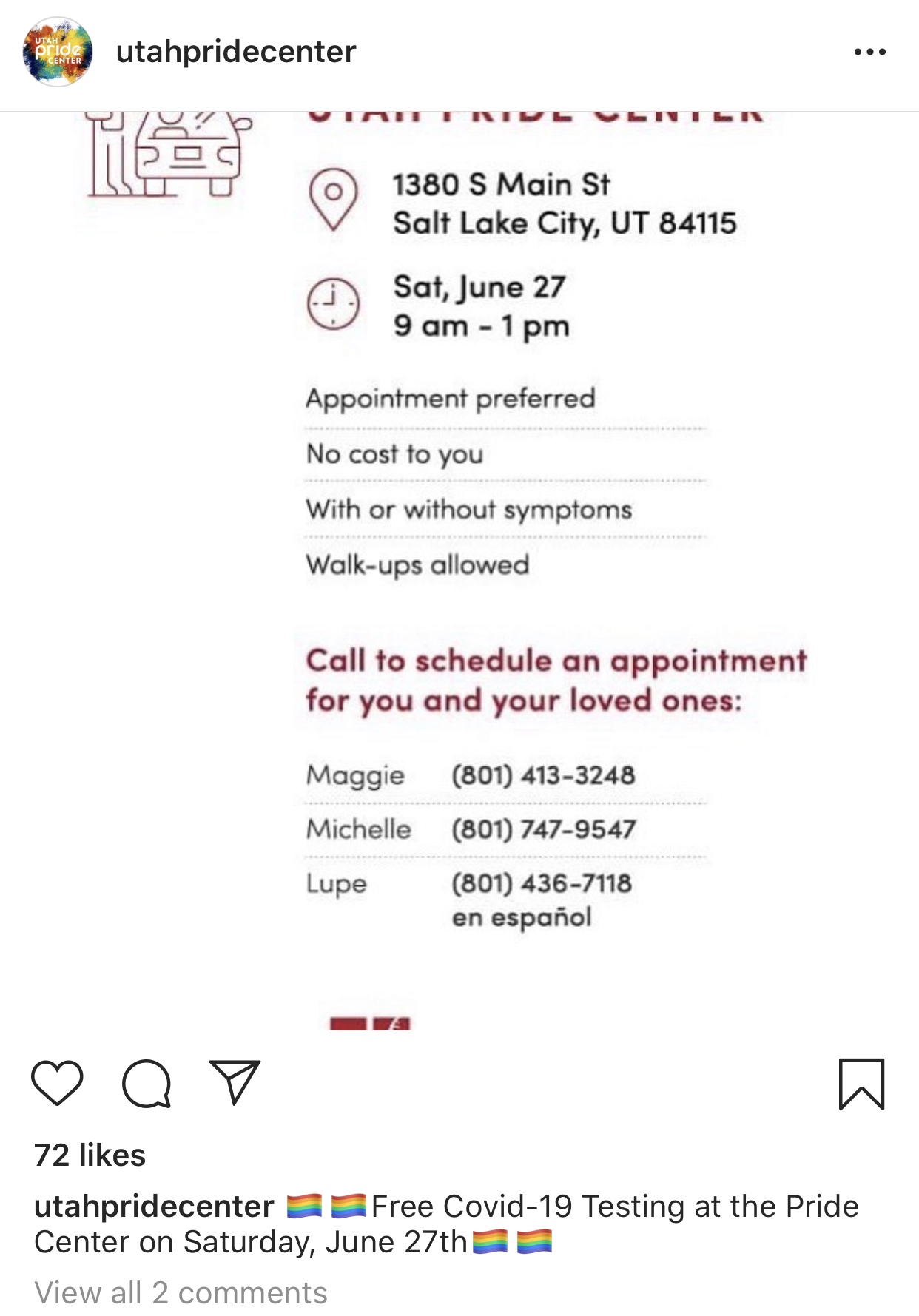 The Utah Pride Center shared on their Instagram account that they would be offering free Covid-19 testing on June 27, 2020. Access to healthcare and testing is especially critical for marginalized communities, such as the LGBTQ+ community.