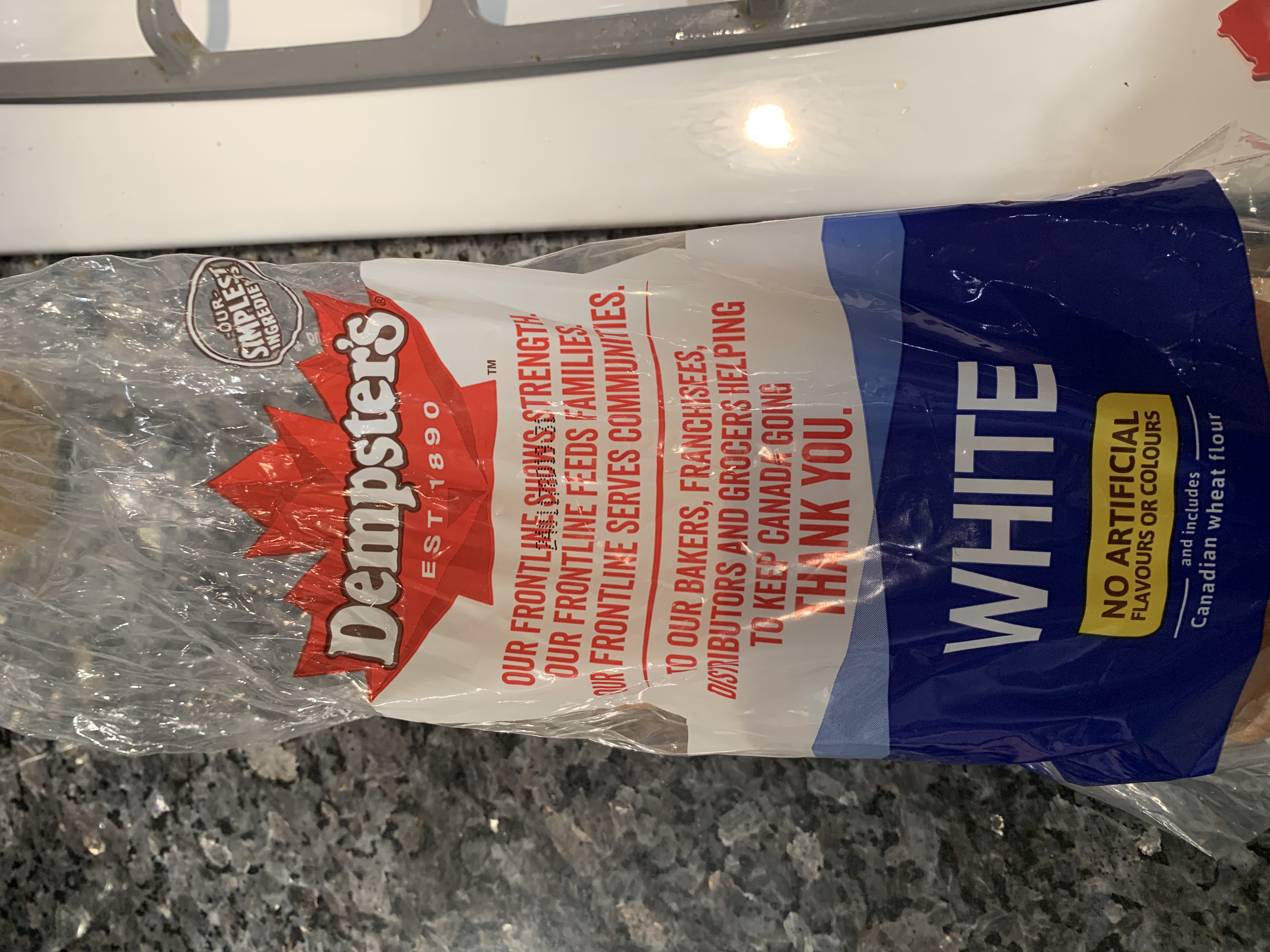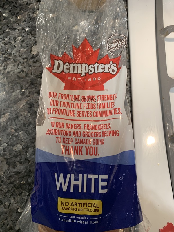 For the first time since coming home to live with my parents for the summer/the pandemic my mom bought the brand of bread and thickness of slice I like (she prefers thin slice Wonderbread.) Demster's is a well known and established Canadian brand. It was only when about 3/4 of the way through the loaf that I noticed the message on the bag for grocery and food chain workers. In red font to match the Canadian Maple Leaf which if part of the company's logo and reflect the patriotic nature of the message it reads: "OUR FRONTLINE SHOWS STRENGTH. / OUR FRONTLINE FEEDS FAMILIES. / OUR FRONTLINE SERVES COMMUNITIES. / TO OUR BAKERS, FRANCHISEES, DISTRIBUTORS, AND GROCERS HELPING TO KEEP CANADA GOING / THANK YOU.