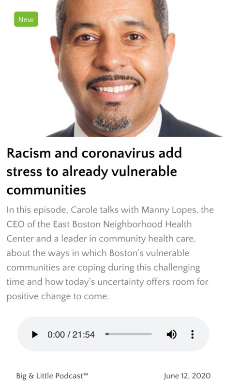 This is the third episode of the Boston Children's Museum's podcast, Big & Little, a podcast for adults about kids and families. "In this episode, Carole [Charnow} talks with Manny Lopes, the CEO of the East Boston Neighborhood Health Center and a leader in community health care, about the ways in which Boston's vulnerable communities are coping during this challenging time and how today's uncertainty offers room for positive change to come."