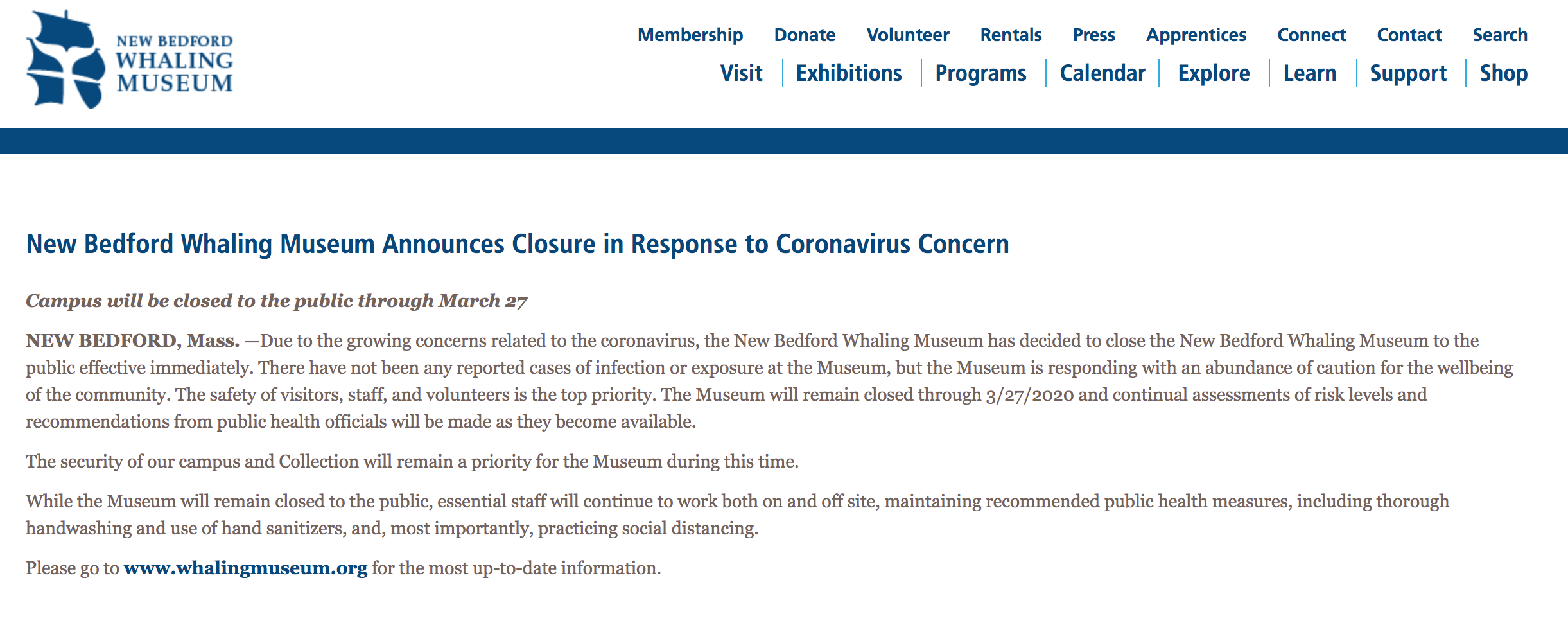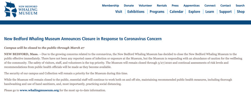 The New Bedford Whaling Museum announces closure due to COVID19 pandemic.