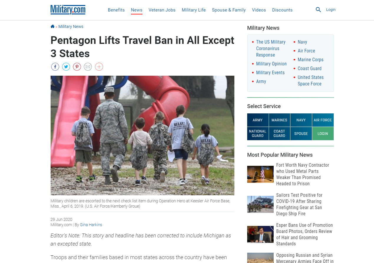 This is an article about how the military has lifted the travel band it had in place due to the coronavirus.My family is personally affected by this since we are slotted to P.C.S. this fall.Not all states are cleared by the military and I fear with the country opening back up there will be many more cases and possibly more delays in PCS orders because of it.