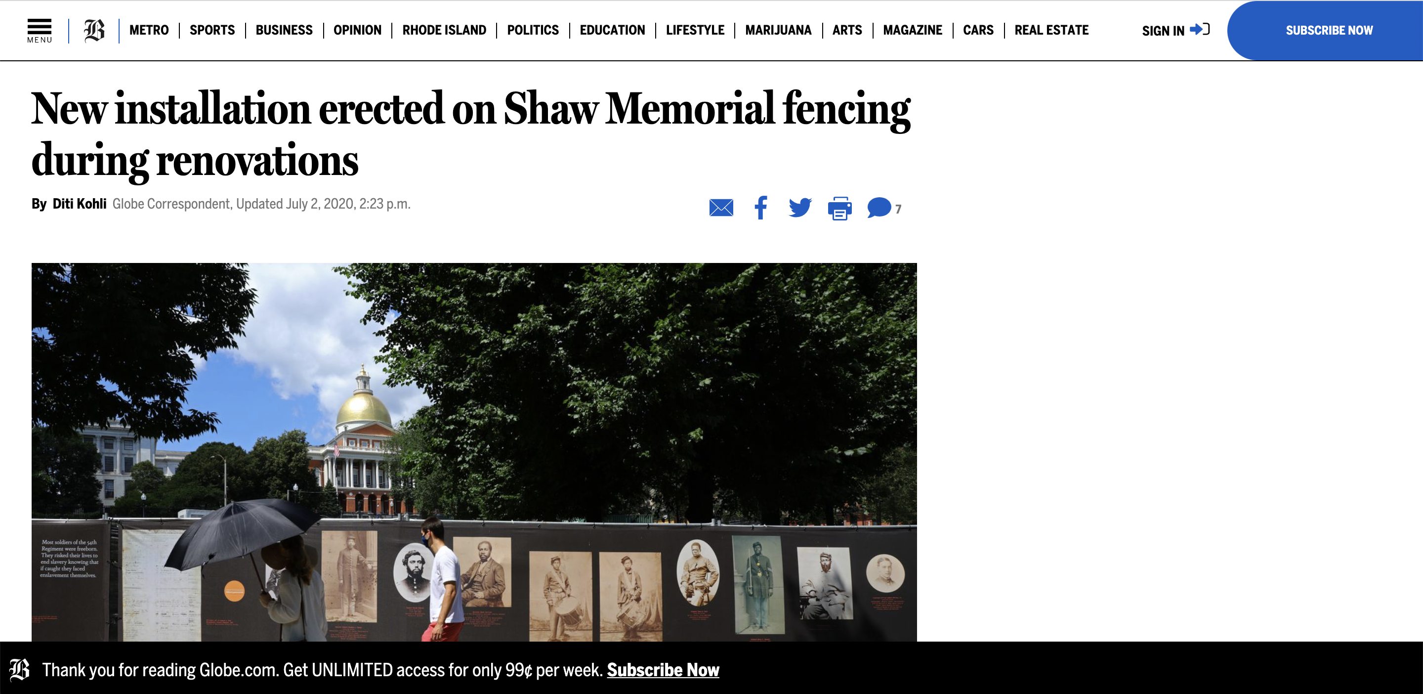 Article from the Boston Globe covering the exhibit installation that has been placed on fencing surrounding the Memorial to the Massachusetts 54th Regiment, which serves as the starting point for the Black Heritage Trail. The exhibit covers the history and significance of the regiment, and includes pictures of primary sources related to volunteers. Outdoor exhibitions carry special importance during the time of the CoVid-19 pandemic, as they offer opportunities for the public to continue to interact with history even as museums remain inaccessible.