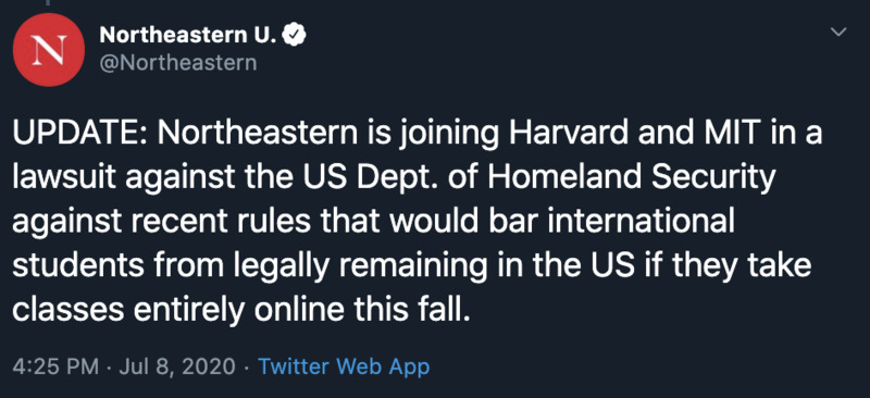 MIT and Harvard filed a civil action lawsuit against the Department of Homeland Security against recent rules that would bar international students from legally remaining in the US if they take classes entirely online this fall. Thousands of students would lose scholarships, their inability to research, and their student status if the government decided to follow-through. These Boston universities are seeking a way to prohibit this ruling.