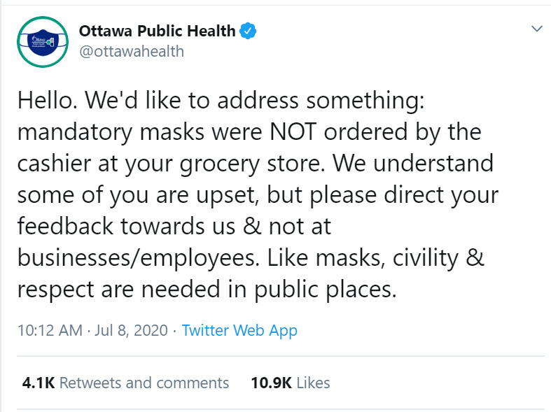 A tweet from Ottawa Public Health addressing those who have been taking out their anger regarding the city's recent move to mandate masks in public spaces towards business employees attempting to enforce the rule.
