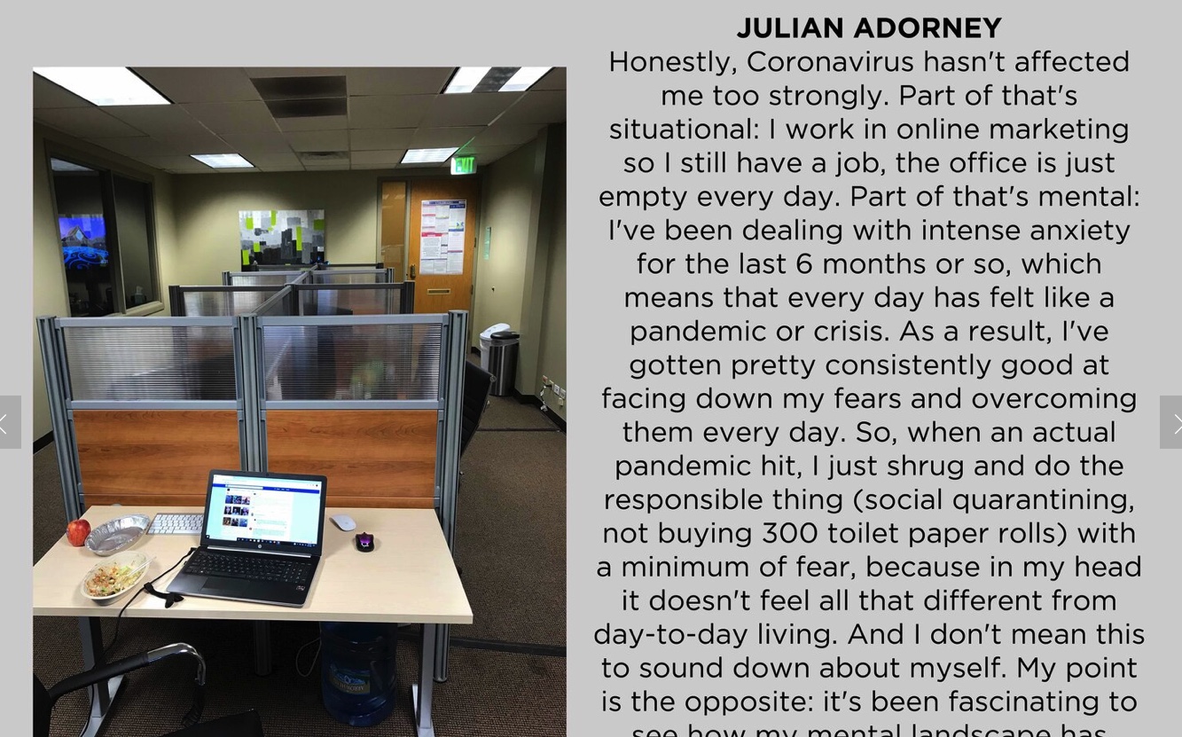 Honestly, Coronavirus hasn't affected me too strongly. Part of that's situational: I work in online marketing so I still have a job, the office is just empty every day. Part of that's mental: I've been dealing with intense anxiety for the last 6 months or so, which means that every day has felt like a pandemic or crisis. As a result, I've gotten pretty consistently good at facing down my fears and overcoming them every day. So, when an actual pandemic hit, I just shrug and do the responsible thing (social quarantining, not buying 300 toilet paper rolls) with a minimum of fear, because in my head it doesn't feel all that different from day-to-day living. And I don't mean this to sound down about myself. My point is the opposite: it's been fascinating to see how my mental landscape has served as a training gym to prepare me for tough situations.