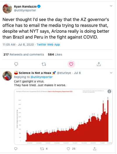 It's odd that the U.S. response to COVID has been disjointed among national, state, and municipal efforts. Peru had a strong, concerted national effort, but there are so many factors that are contributing to the spiraling infection rate including a day-to-day economy, and the lack of economic support for families. But for officials in Arizona to point the finger and say- hey we're doing better than...seems shameful. Our infection rates could be under control if we followed a systematic public health program. Instead, most businesses are so desperate to reopen like bars and restaurants that they don't really protect customers or staff. The rate of infection among young people started to creep up after Arizona reopened in May, and last week Tempe had to close its bars again to get the situation under control.