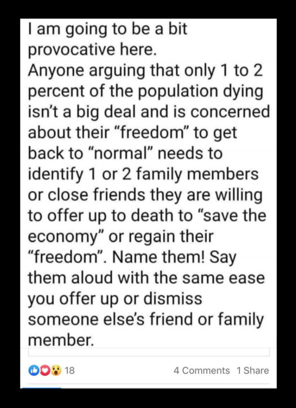 People have varying attitudes about Coronavirus vs. the economy. Some say, "Eh, what's 1-2% of the infected dying. This meme hits home by saying: Ok, name them then. Who would you wish death upon within your circle of family and friends.