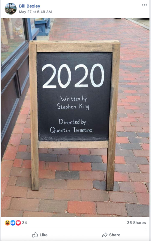 If 2020 were a movie it would be written by the foremost horror writer, Stephen King, and it would be directed by Quentin Tarantino, the director with the most unusual and sinister touches. This year can't be real--it must be a horror film! That describes what we're living through now.