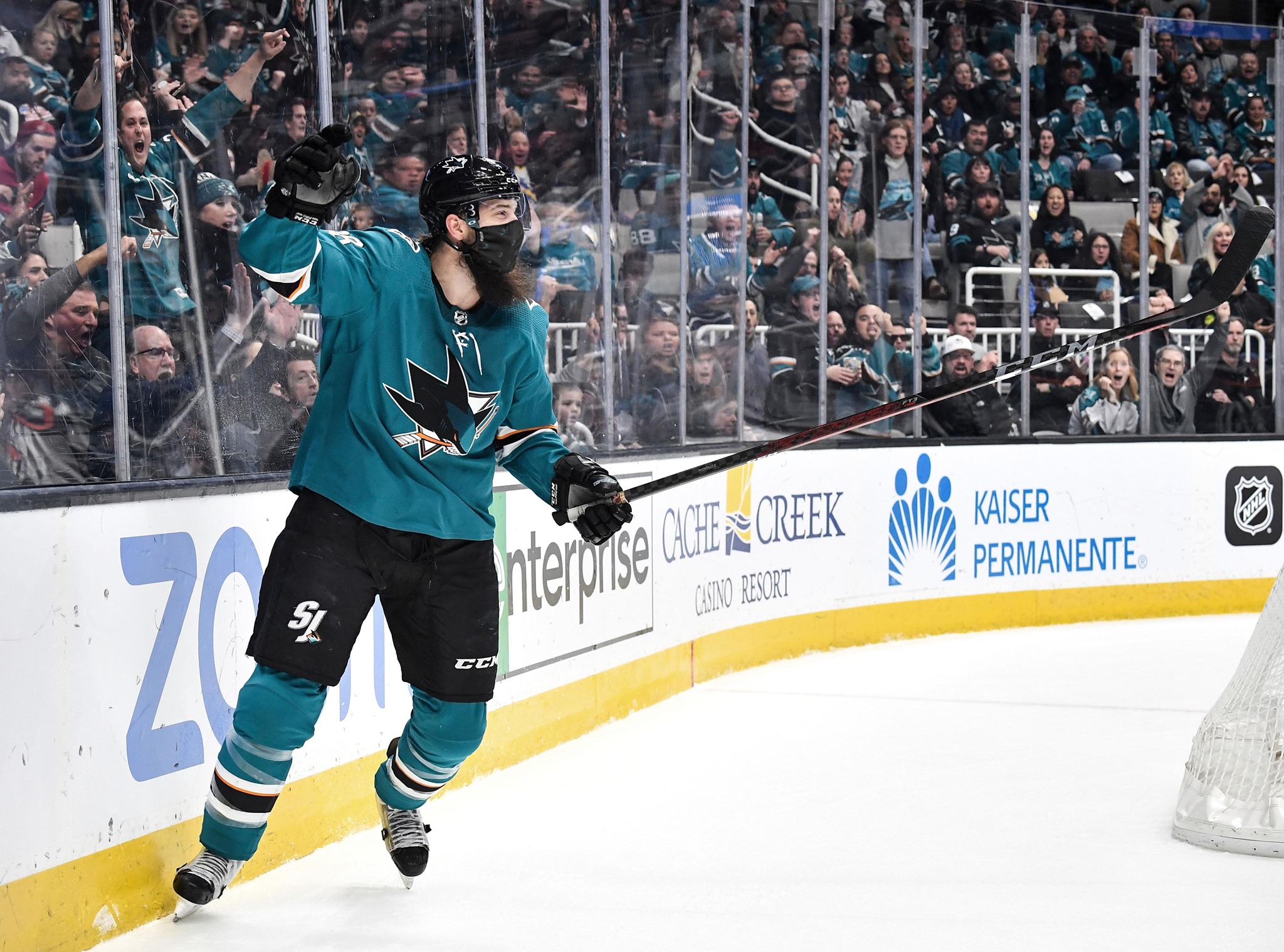 Edited photograph showing San Jose Sharks defenseman Brent Burns wearing a mask while celebrating a goal. This photograph was posted on San Jose Sharks social media channels with the caption, "Stop the spread. Stay stick-feet apart."