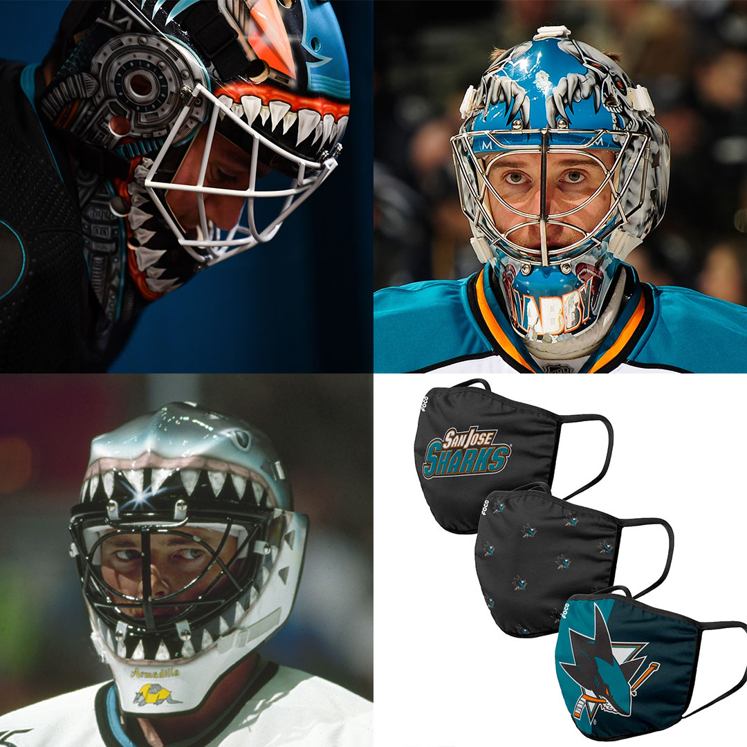 Photograph collage showing San Jose Sharks goaltenders Martin Jones, Evgeni Nabokov, and Brian Hayward wearing goalie masks, along with three face masks. This photograph was posted on San Jose Sharks social media channels with the caption, "Our favorite masks 😍."