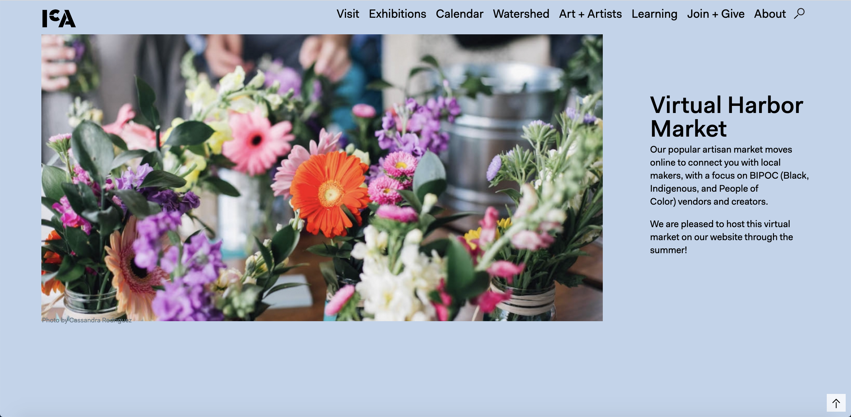 Webpage from the Institute of Contemporary Art Boston that functions as an online version of the museum's summer harbor market. The page links to stores of BIPOC artisans and artists in the Boston area. Museums are more than just sites of learning, their spaces are often multi-functional and host many events throughout the year. Given the pandemic, museums have had to employ digital methods in order to take important programs/events and recreate them on their websites.
