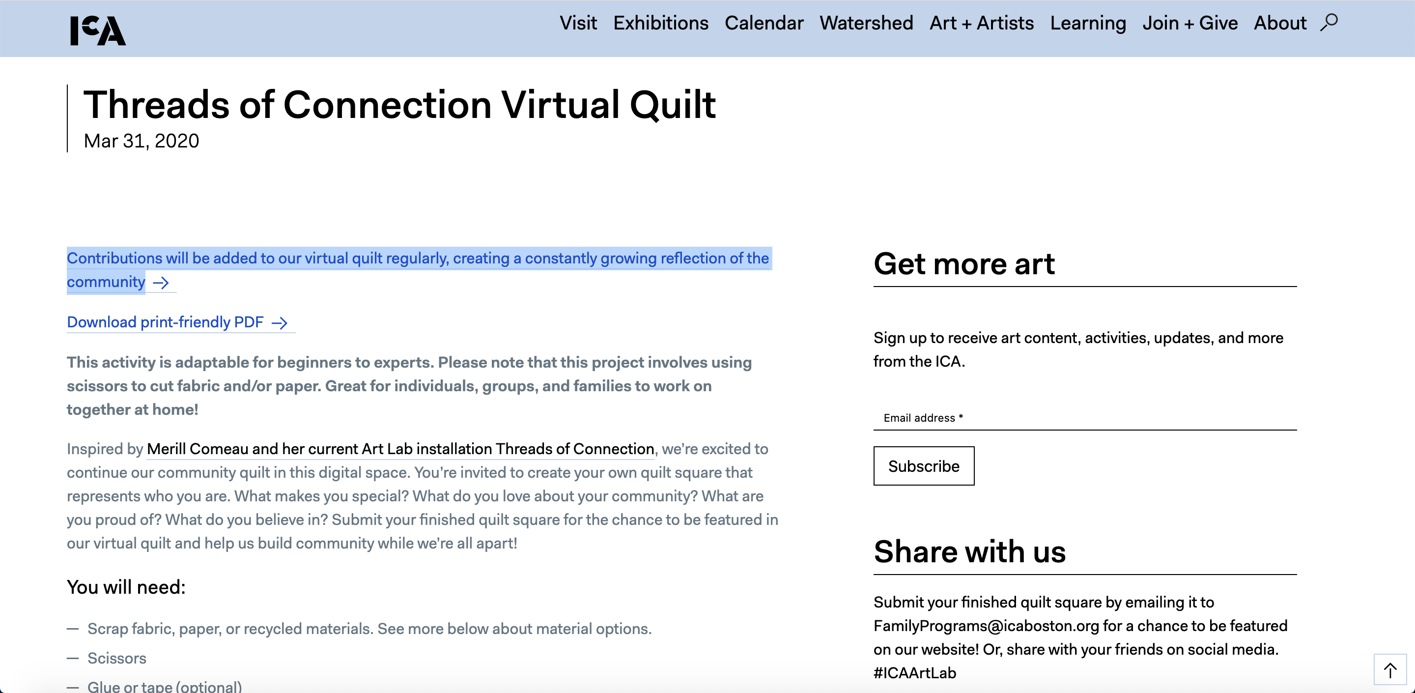 Virtual project from the Institute of Contemporary Art Boston that is an extension of their Art Lab installation Threads of Connection. The project prompts people of all ages to create a quilt square of their own and email it to the ICA in order to continue building a vast digital quilt. This activity combines two things that museums have sought to do during social distancing; give people activities while at home and engage with them on social media. in doing so, it keeps museums relevant and engaging even if people cannot physically access their collections.