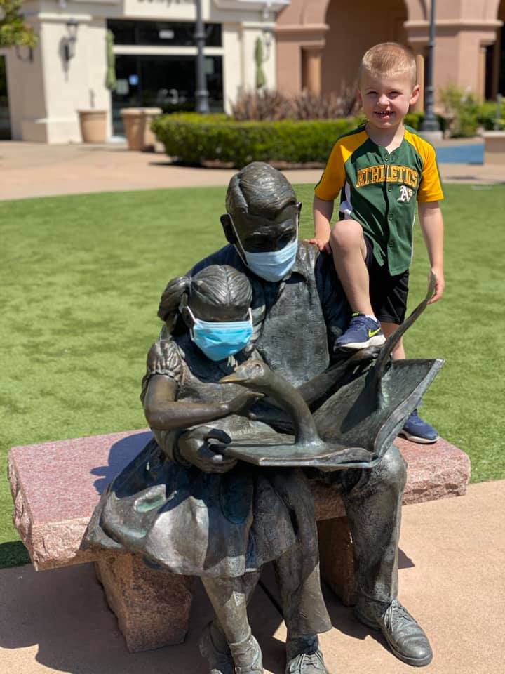 A whimsical statue of a child and adult reading a storybook with geese emerging from the pages is adorned with masks. The presence of COVID-19 is evident in many local public spaces, even when the public spaces are devoid from crowds of people. This photograph was taken in Danville, California at Blackhawk Plaza.