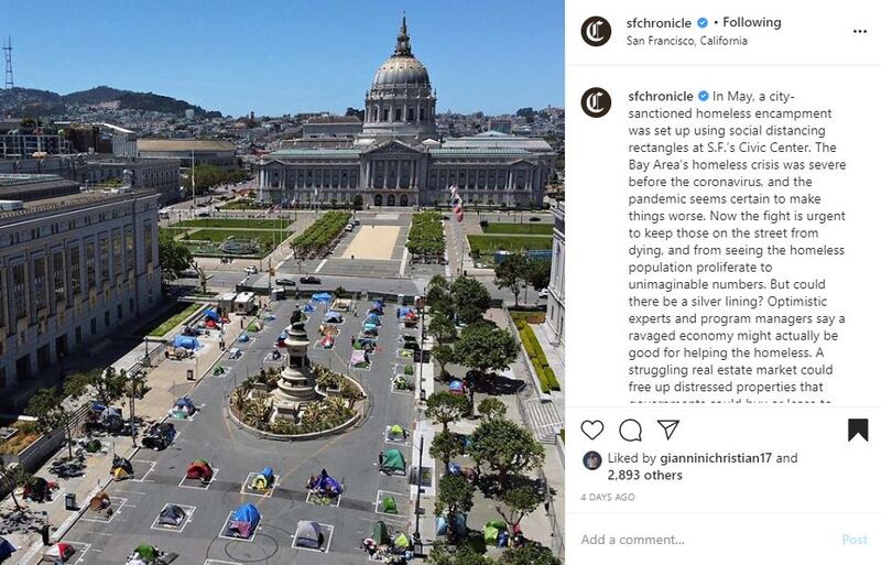 The caption for the photo on Instagram reads: "In May, a city-sanctioned homeless encampment was set up using social distancing rectangles at S.F.’s Civic Center. The Bay Area’s homeless crisis was severe before the coronavirus, and the pandemic seems certain to make things worse. Now the fight is urgent to keep those on the street from dying, and from seeing the homeless population proliferate to unimaginable numbers. But could there be a silver lining? Optimistic experts and program managers say a ravaged economy might actually be good for helping the homeless. A struggling real estate market could free up distressed properties that governments could buy or lease to use as homeless shelters and housing. The shock of millions of Americans losing jobs, homes and health insurance could trigger a wave of New Deal-style government programs to lift the poor."