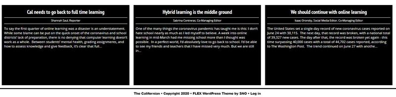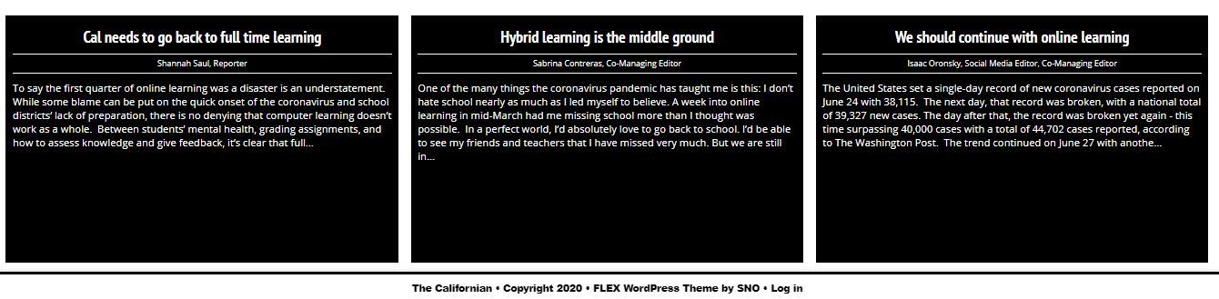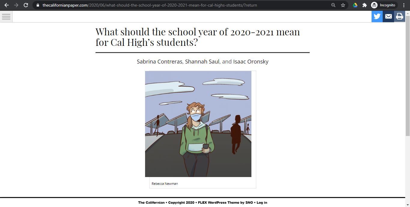 The Californian, a student run newspaper at California High School in San Ramon, recently ran the story "What should the school year of 2020-2021 mean for Cal High's students?" The story features three student articles, each advocating for a different scenario. The first discusses returning to school full time, the second champions a hybrid learning model, and the third article evaluates fully remote online learning. All of the articles address the challenges and realities of education during the COVID-19 pandemic for students. Interestingly, none of the articles discuss the impact of these models on teachers.