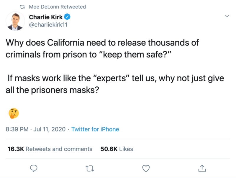 Twitter user @MoeDelonn retweeted the original tweet, which was created by Twitter user @charliekirk11