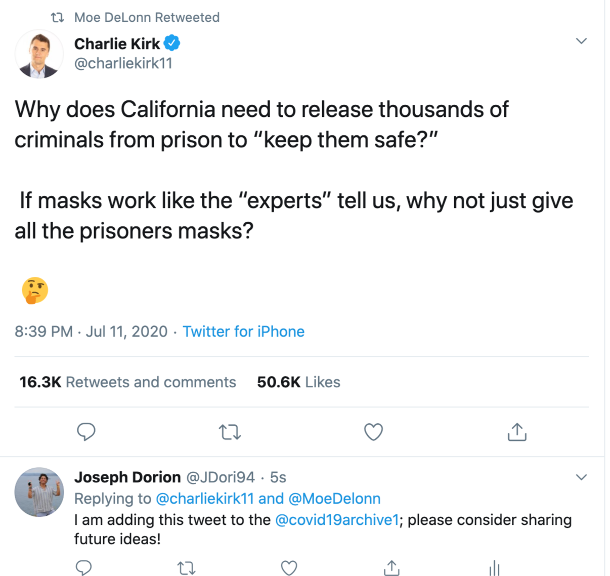 This item was added TAGS v6.1.9.1. I originally searched under the hashtag #california. Within that search, I have chosen to add the following tweet because it branches off on one of the arguments against wearing masks: their efficacy.