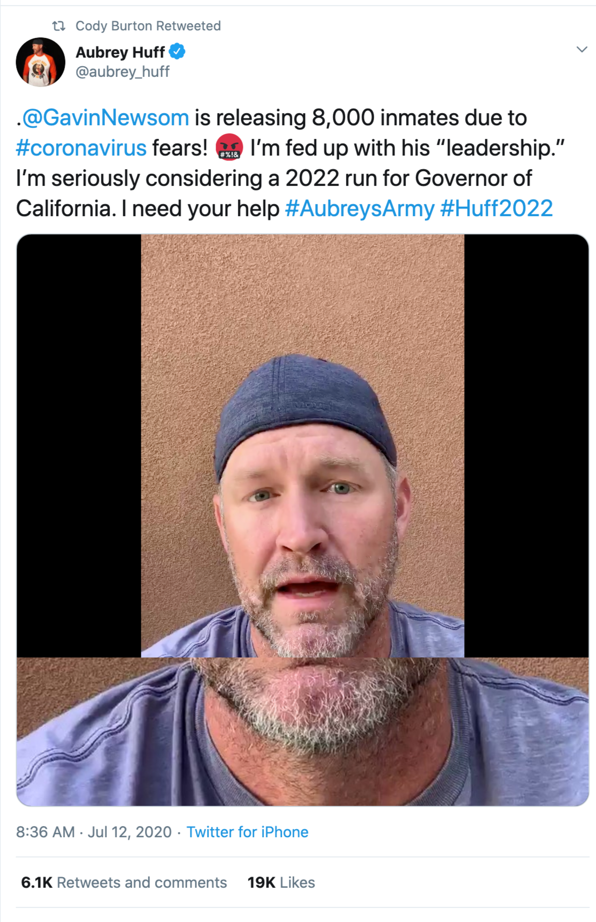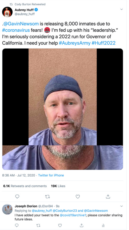 Twitter user @CodyBurton23 retweeted the original tweet, created by Twitter user @aubrey_huff, who replied to a tweet from Twitter user @GavinNewsom