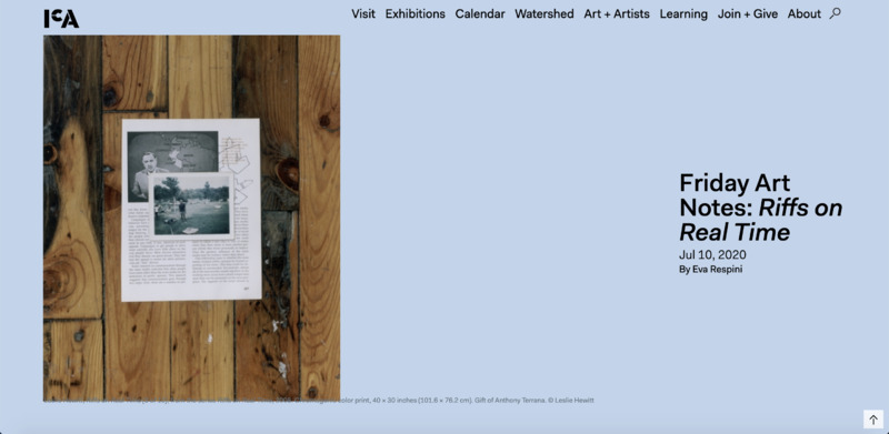 Essay written by the Barbara Lee Chief Curator of the Institute of Contemporary Art in Boston, reflecting on a piece of art in the museum's collection. This specific essay highlights the photographic series Rifts on Real Time, created by Leslie Hewitt. The essay itself reflects on the concept of time during of time during the pandemic, and the large amounts of time people have spent inside. In relating the thesis of the art to a common experience for some during the pandemic, the essay highlights how museums are relating their collections to the experiences of living in 2020.