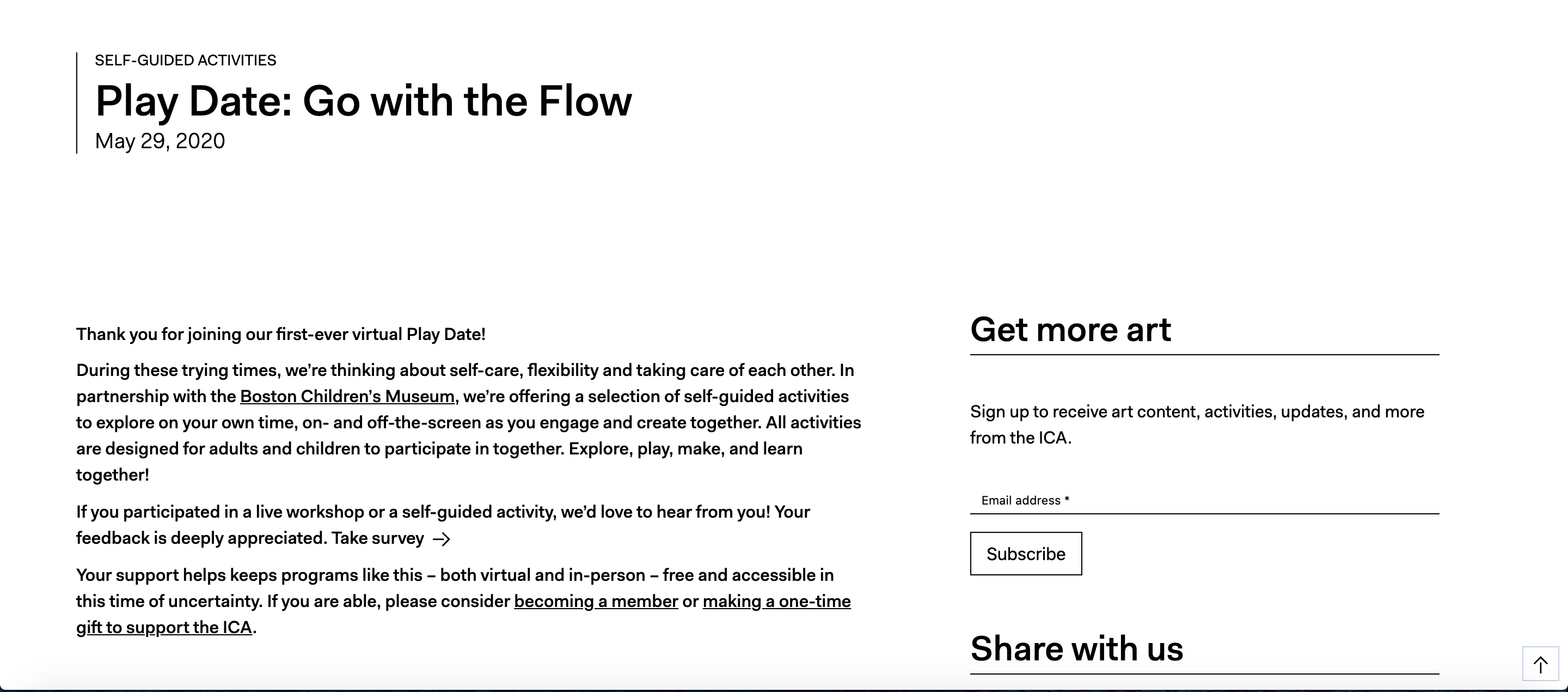 Self-guided activities that are part of the Play Date event series for children and families hosted by the Institute of Contemporary Art in Boston. As museums had to transition to virtual engagement and shut down their physical sites, they had to find new ways to interact with their audience. This was especially true for events tailored for younger audiences, who might not find the same enjoyment from a virtual museum as opposed to the physical space.