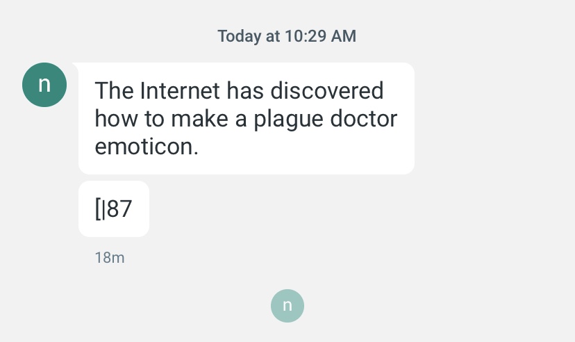 A text message I received from my brother where he shares a new emoticon created from keyboard characters which he discovered has been created during the pandemic which represents the classic plague doctor mask of the early modern period, which is frequently being used now as a reference to the current pandemic and the need to wear masks.