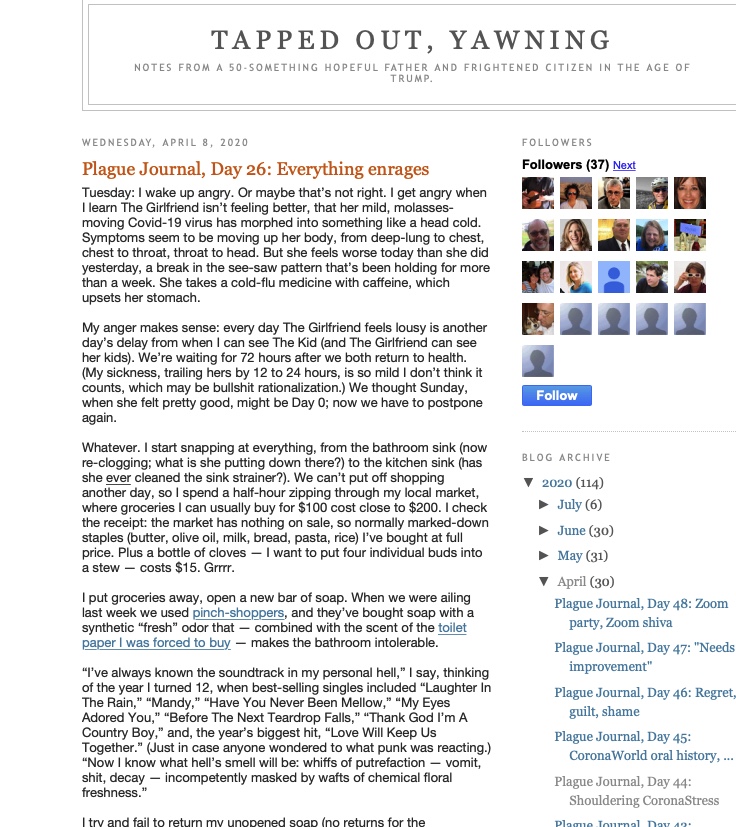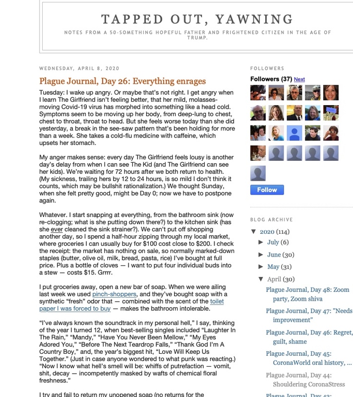 I'm keeping a Covid-19 journal. Here's the latest entry, in which I battle unwarranted rage, stoke warranted rage, and allow my mom's exercise regime to crack my armor.
