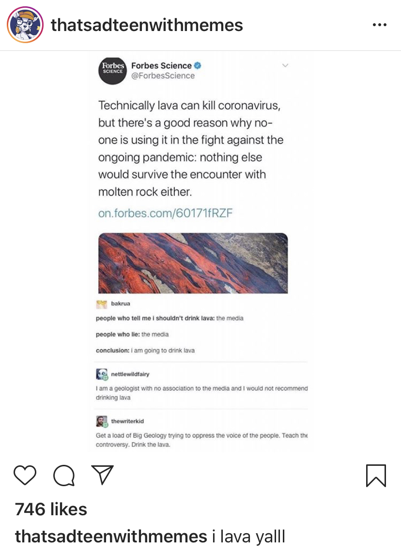 This is a humorous meme about the idea of using lava to fight COVID-19. Don't do it! President Trump has suggested injecting disinfectant, getting sunlight into the body, drinking bleach, taking hydroxychloriquine as a preventative measure, and having it magically disappear with warm weather.