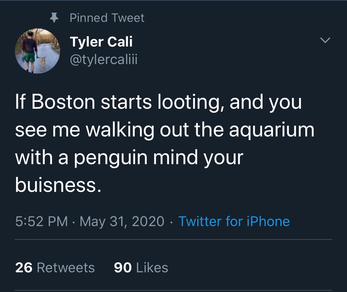This meme is a humorous statement about that looting. The creator claims he/she wants to steal a penguin if looting starts in Boston. Mind your business if you see him walking out holding one.