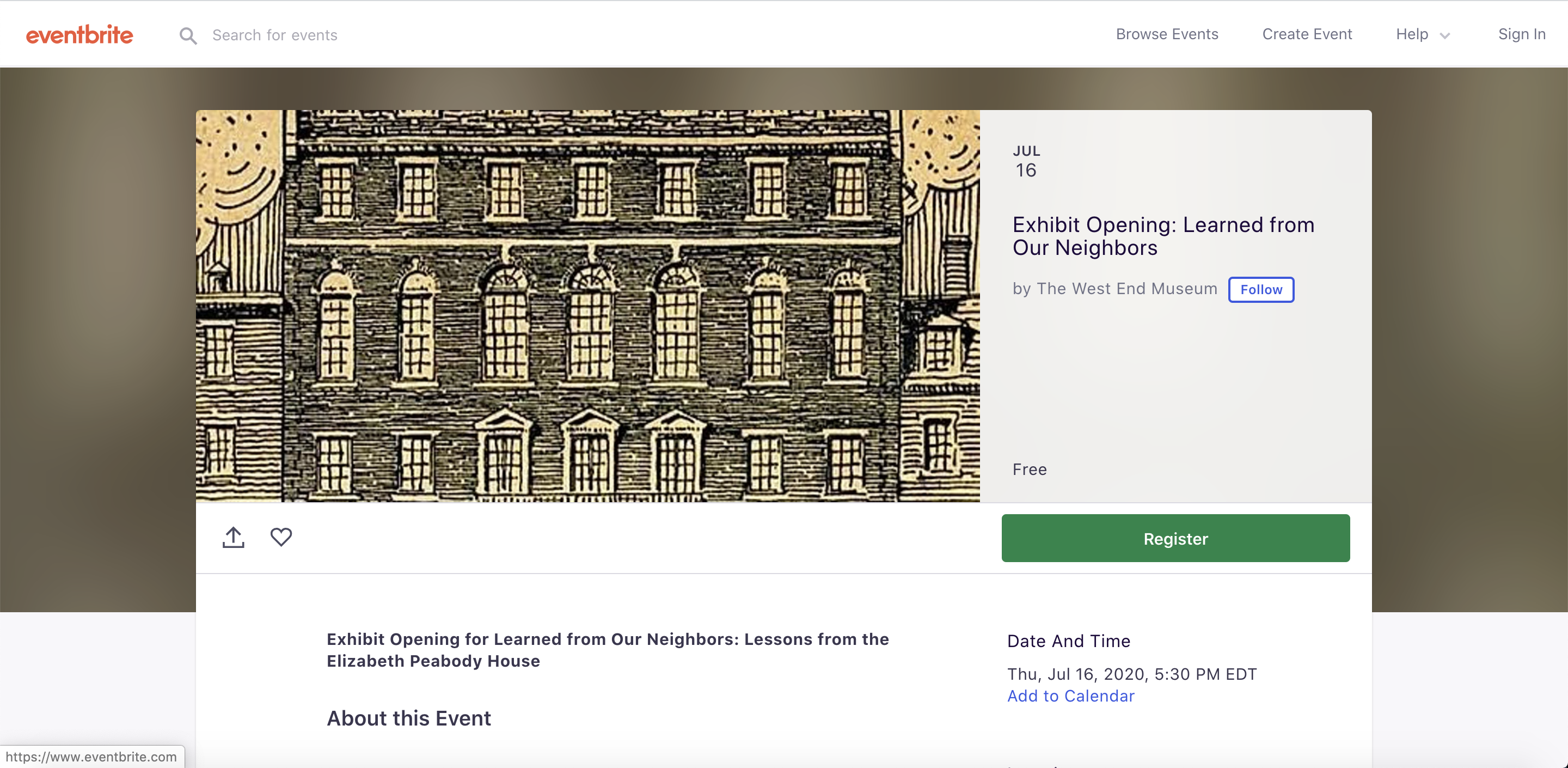 Eventbrite webpage for the virtual exhibit opening of Learned from Our Neighbors: Lessons from the Elizabeth Peabody House, which is housed at the West End Museum in Boston. The page lists what the event will include and how the exhibition was created. This object highlights how museums are attempting to engage with their audiences during social distancing, including community cultural heritage institutions.